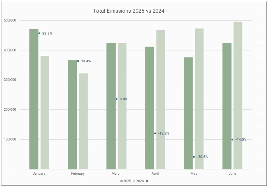 Thereafter, in 2025, both April and May show drops in emissions from month to month (3.1% and 8.7% respectively). This appears to be another instance of the so-called 'Trump effect’, with retailers still carrying excess inventory from the Q1 import surge. Moreover, both in April and May, emissions were significantly lower year-over-year (12.3% and 20.6% respectively). While emissions dropped month-to-month in 2025, the opposite happened in 2024. In June 2025, emissions rebounded by 13%, but remained 14.5% lower than in June 2024.