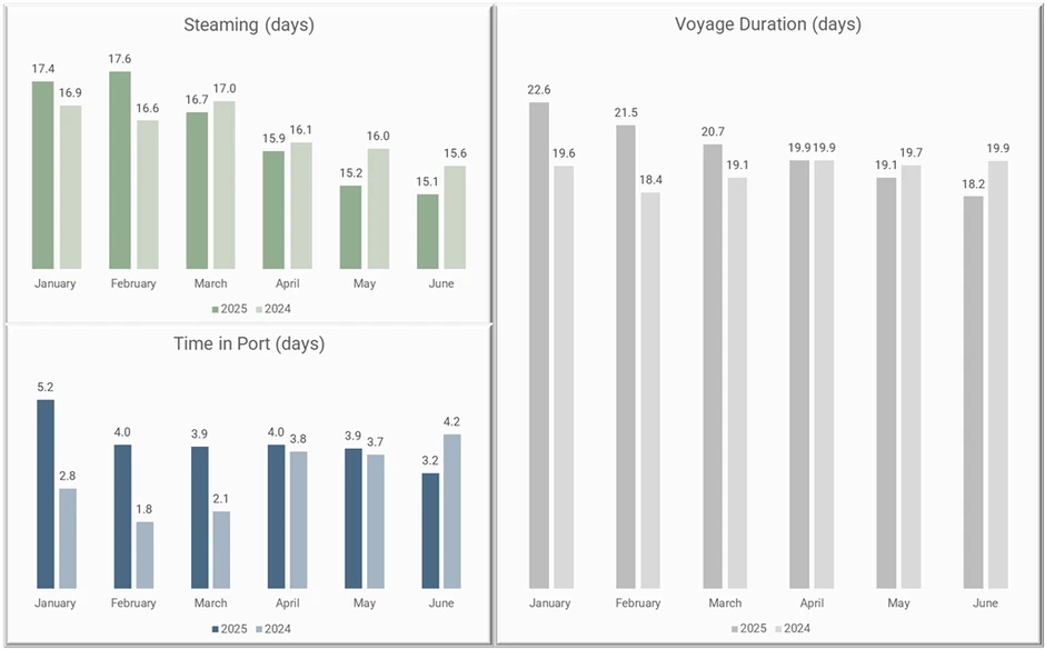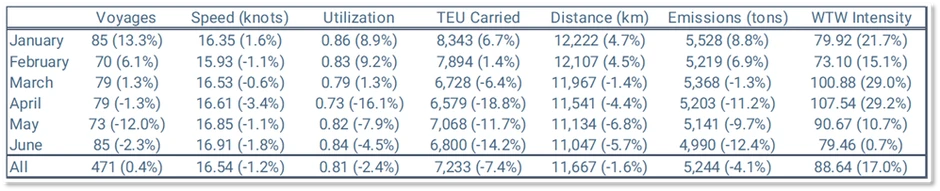 June is another quite interesting month; 85 voyages took place (same as January), with a utilization of 84% (second highest after January: 86%). Speed remained at 16.9 knots, as in May, slightly increased from January (16.4 knots). The time spent in port per voyage averaged 3.2 days (instead of 4.2 days in June 2024). Overall, well-to-wake intensity was 79.5, almost equal to January at 79.9 g CO2e per TEU km.